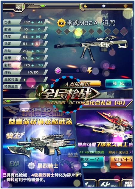 全民槍戰(zhàn)》新版本中加入了增強(qiáng)版槍械強(qiáng)化改裝玩法,收集槍械碎片合成特定槍械,騎士系列、生化系列等20余種槍械皆可合成,為你的軍火庫添磚加瓦,輕松應(yīng)對不同的...
